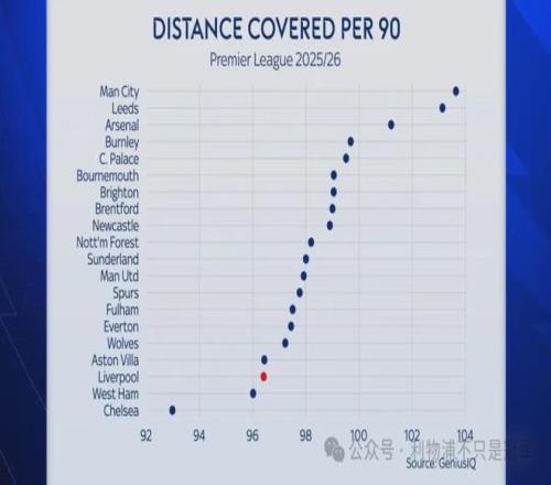 在与曼城比赛中,利物浦只有8次抢断,而曼城比利物浦的两倍还多,17次。 3、跑动距离 本赛季英超各队场均跑动距离,曼城高居第一,而利物浦,你可能难以置信,仅排倒数第三。