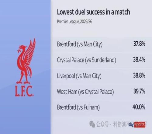 周一我们在利物浦0-3曼城的复盘中指出,利物浦几个丢球都与斯洛特遭瓜迪奥拉战术碾压有关,同时我们也特别提到,利物浦在逼抢、身体对抗的强度上,也完全被曼城压倒。技不如人、身体又拼不过,利物浦岂能不输? 今天天空体育列出了一组数据,更加清晰的体现了利物浦在身体、对抗、逼抢方面的差距。别忘了,利物浦上周二打皇马,曼城上周三打多特,两队周日比赛,利物浦还比曼城多了一天备战时间。输了身体,实在不应该。 1:本场利物浦只赢得了38.8%的对抗,创造了本赛季英超所有比赛第三低的对抗成功率。