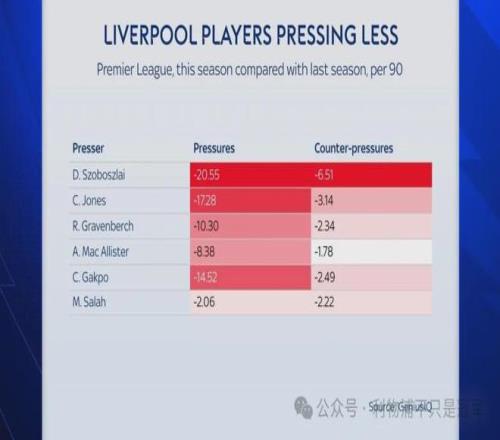 当然也应该看到,利物浦就地反抢数据的下滑,与目前英超更多球队采用长传避开利物浦反抢的战术有关,但天空体育指出,利物浦就地反抢数据的下滑,超过了英超各队的平均值。 同时,要想让逼抢更有效果,需要全队协同作战,是一种集体行为,需要全队的同步和默契,而利物浦在今夏大换血之后,不但有球时组织进攻需要磨合,在无球逼抢时的同步和默契也需要重新构建,这也是一种化学反应。 除了三大新援伊萨克、维尔茨和埃基蒂克这方面需要磨合提升,即便上赛季利物浦夺冠阵容中的6名中前场球员,在高位逼抢和就地反抢这两项数据也比上赛季下降。(索博斯洛伊数据的下降,与他在一些比赛中客串右后卫有关。)