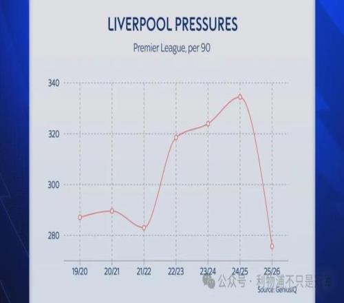 而在斯洛特时代,利物浦跑动距离的下降也是某种“有意为之”,因为斯洛特更强调控制,而不是渣叔的重金属,这在上赛季也帮助利物浦利物浦在夺冠之路上节省和积蓄了体能、减少了伤病。 但是本赛季随着成绩的下滑,跑动距离的下降就要不可避免的背锅了。 4、高位逼抢(Press) 上赛季利物浦的逼抢次数超过此前5个赛季,但本赛季却急剧下滑到7个赛季以来的最低值。