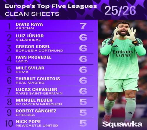 1-阿森纳 戴维-拉亚(出场11次,完成7次零封) 2-比利亚雷亚尔 路易斯-儒尼奥尔(出场9次,完成6次零封) 3-多特 科贝尔(出场10次,完成6次零封) 4-拉齐奥-普罗韦德尔(出场11次,完成6次零封) 5-罗马 斯维拉尔(出场11次,完成6次零封) 6-皇马 库尔图瓦(出场12次,完成6次零封) 7-巴黎 舍瓦利耶(出场12次,完成6次零封) 8-拜仁 诺伊尔(出场9次,完成5次零封) 9-切尔西 桑切斯(出场11次,完成5次零封) 10-纽卡 波普(出场11次,完成5次零封) 【上咪咕独家看英超】 |