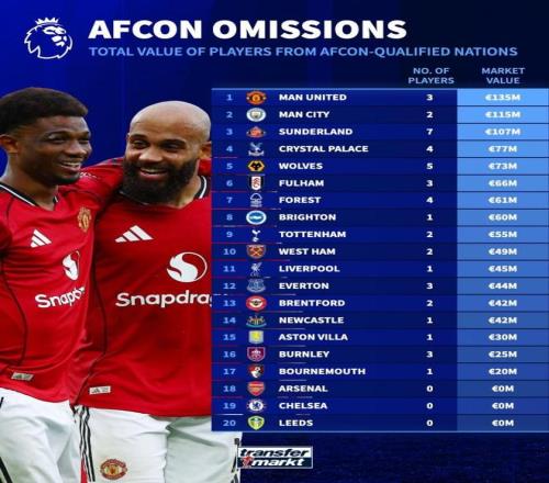 “他进球比亚马尔多,盘带也更好,在禁区内的表现也更出色。” 消息来源:Matías Palacios 3 - 各支队伍被非洲杯制约 德国转会市场统计了英超各队将参加非洲杯球员的身价,并列出排名,曼联1.35亿欧居首,曼城1.15亿欧次席。