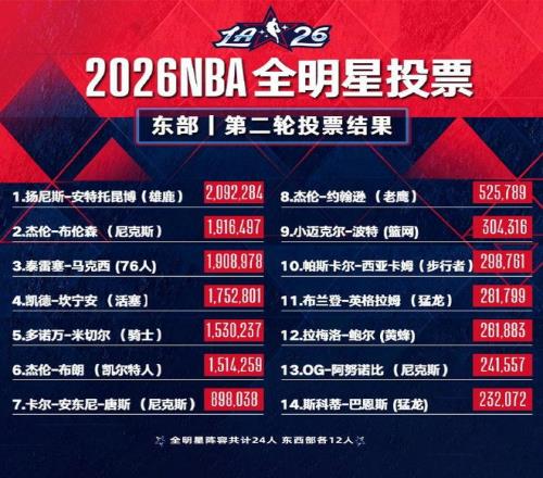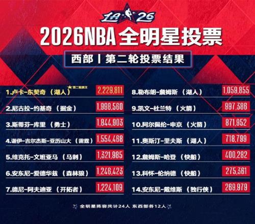 北京时间1月7日,NBA官方公布了2026年NBA全明星第二轮球迷投票结果,洛杉矶湖人后卫卢卡·东契奇与密尔沃基雄鹿前锋扬尼斯·安特托昆博,分别继续领跑西部和东部。东契奇为第二轮票王,詹姆斯位居西部第八。 2026年NBA全明星投票将于美国东部时间1月14日晚上11点59分截止。全明星首发阵容将于1月19日公布。
